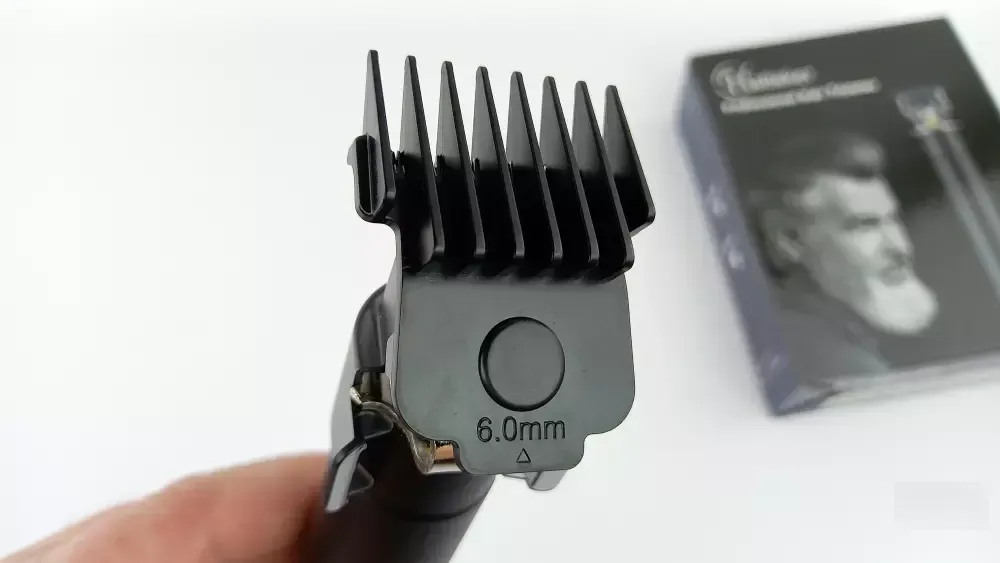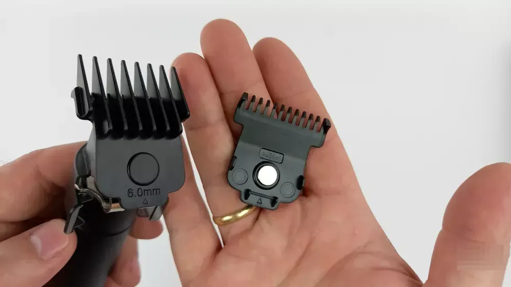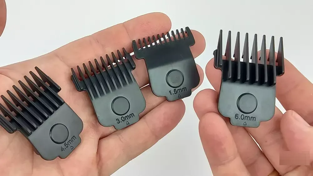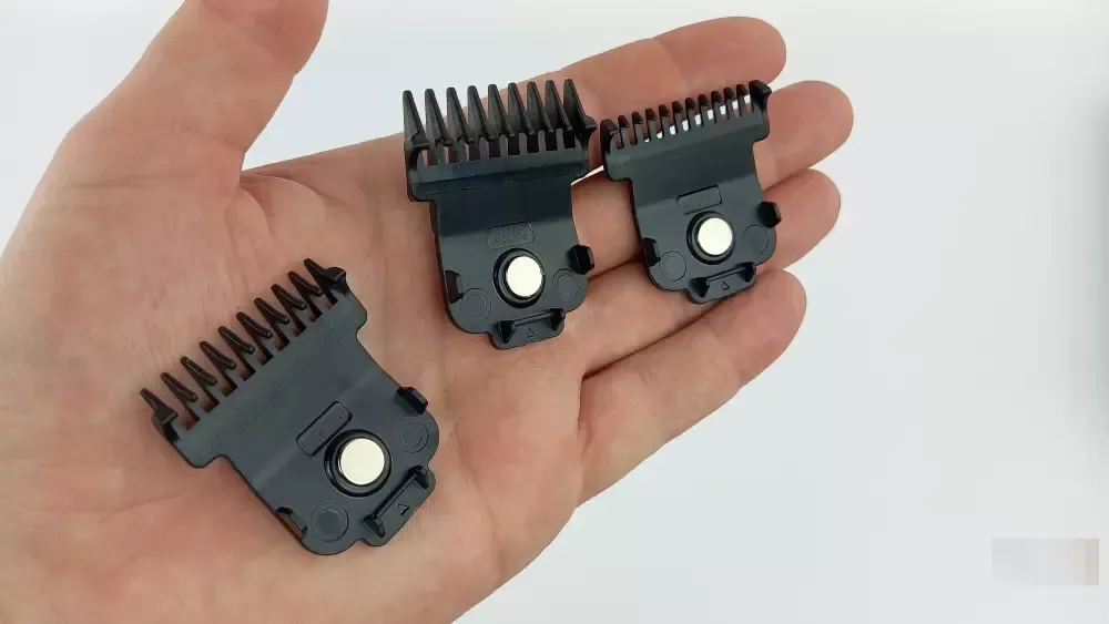 - Magnetic comb guards. There are four of them: 1.5 mm, 3 mm, 4.5 mm and 6 mm. Each guard has a magnet on the inner side. Thanks to this, you don't have to worry about complicated ways of putting the guards on the blade. All you have to do is place them evenly at the front of the blade, and the magnet will hold the comb properly. I can say it is working well.